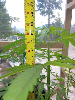 The weather remains cool and windy and mostly overcast. It's beautifully comfortable inside the greenhouse but I fear it's not enough sun for my4plants to grow BIG. The largest one is 22" and it's noticeably larger than the rest as it has been since germination with a thicker stalk and longer branches. Hopefully it's female.